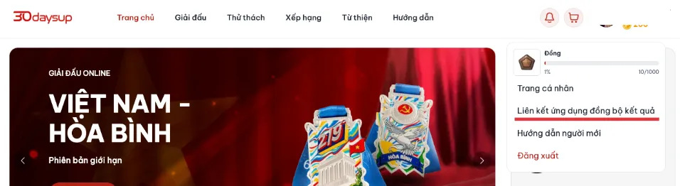 - Từ trang chủ 30daysup.com, nhấn vào tên tài khoản của bạn ở góc phải màn hình. Chọn “Liên kết ứng dụng đồng bộ kết quả” để truy cập hồ sơ cá nhân.