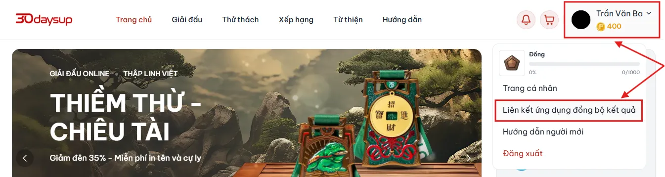 - Từ trang chủ 30daysup.com, nhấn vào tên tài khoản của bạn ở góc phải màn hình. Chọn “Liên kết ứng dụng đồng bộ kết quả” để truy cập phần quản lý liên kết.